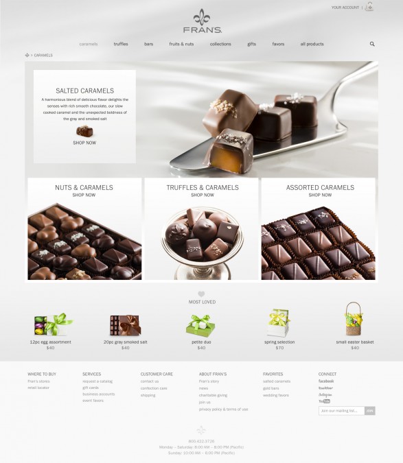 Result: Simple, beautiful, and effective. The end result is a rich and immersive experience which conveys the essence Fran’s Chocolates—crafting each interaction with the same care and consideration that goes into every aspect of their business. Fran’s has seen in upwards of 450% return on investment since the site launched in 2007.